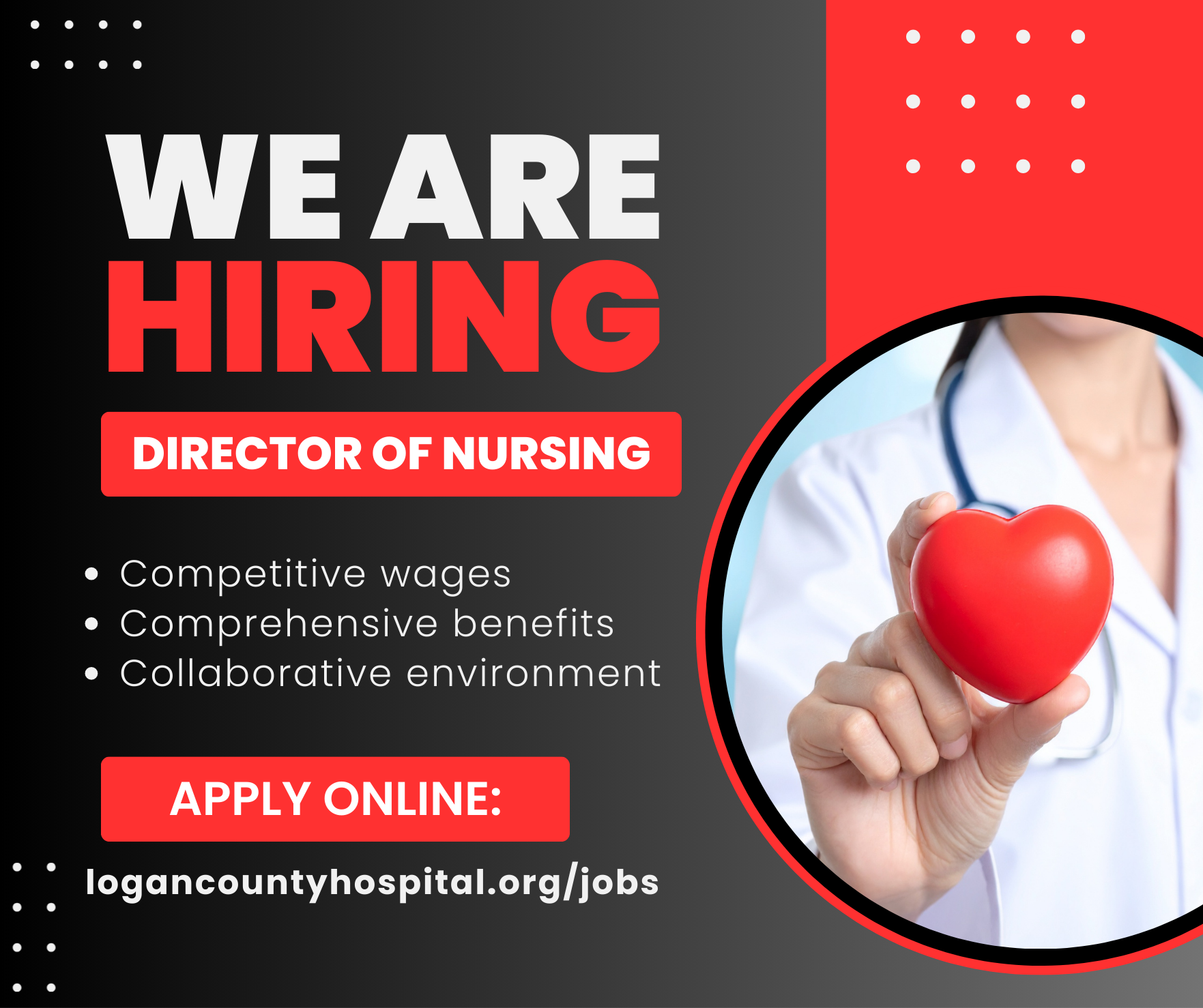 Logan County Hospital is seeking a dynamic and compassionate nursing leader to join our team as Director of Nursing. This key leadership role oversees clinical excellence, supports a collaborative care environment, and helps shape the future of patient-centered healthcare in our community.