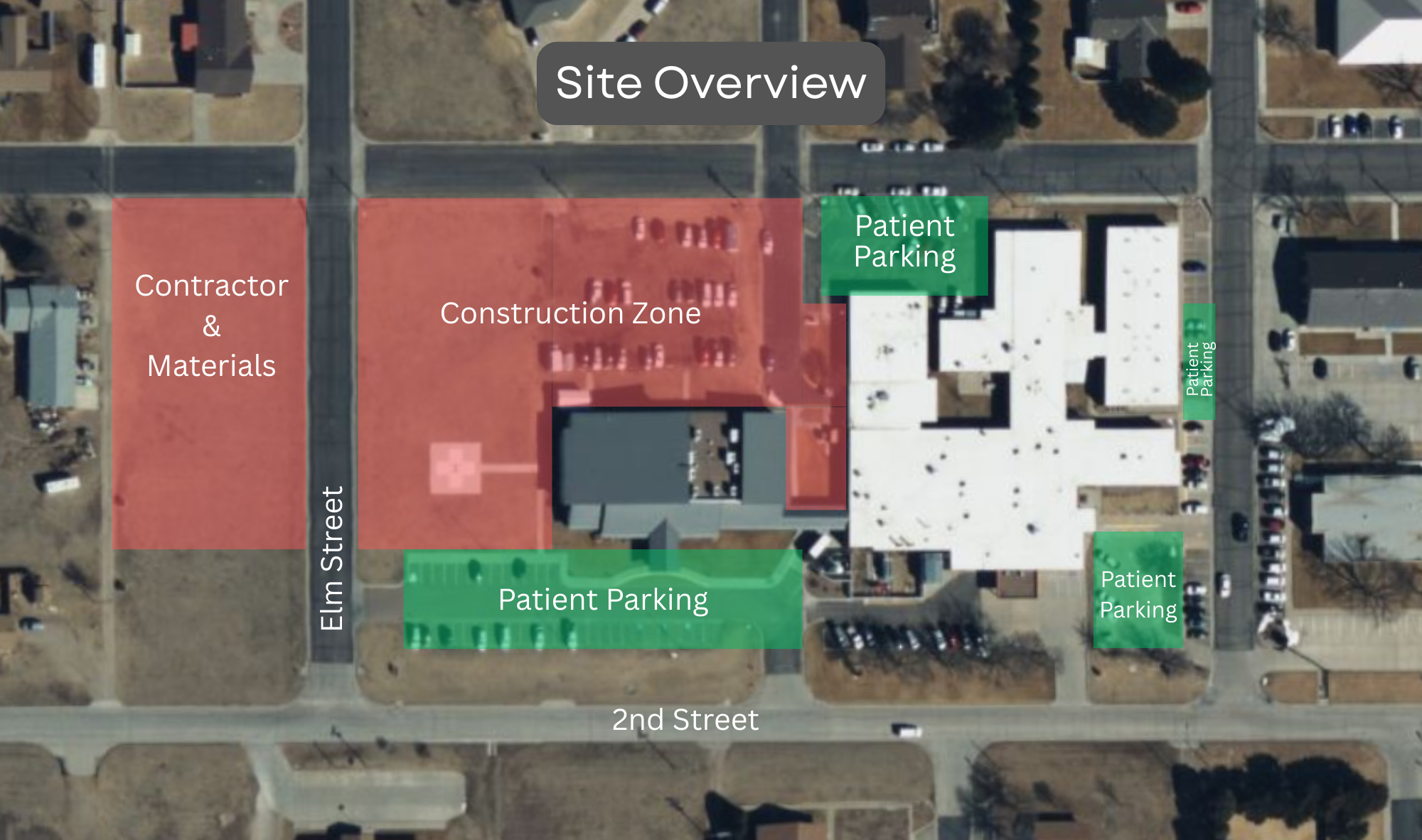 Parking for patients and visitors should experience little impact. Parking in front of the hospital and the Wellness Center will continue to be reserved for patients and visitors. Parking for New Frontiers and the Health Department will also remain, but access to and from that parking lot will only be from the north (3rd Street). The west entry (Maple Ave.) will be blocked.